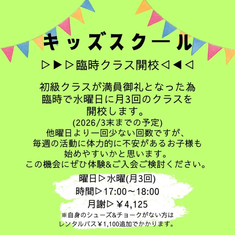 ホームキッズスクール事業 キッズスクール事業 子供たちに身につけてほしいこと 私たちは、クライミングという「遊び」を通して、単に運動能力を高めるだけでなく、子どもたちがこれからの社会で必要となる「生きる力」を育むことを目指しています。壁という課題に挑戦し、考え、乗り越える経験は、問題解決能力、諦めない心、自己肯定感といった「非認知能力」を大きく伸ばします。仲間と励まし合い、目標を達成する喜びを知ることで、心も体も健やかに成長してほしいと願っています。 スクールで得られる5つの効果 ①驚くほどの・体力・運動能力 全身運動でバランス感覚、柔軟性、筋力が向上。他のスポーツにも活きる基礎能力が身につきます。 ②考える力・問題解決能力 ルートを読み解き、攻略法を考えることで、論理的思考力や空間認識能力が自然と養われます。 ③やり抜く力・集中力 難しい課題に挑戦し続ける中で、目標達成意欲と、一点に意識を向ける集中力が育まれます。 ④自信と自己肯定感 「できた!」の成功体験が積み重なり、挑戦する勇気と「自分ならできる」という自信に繋がります。 ⑤コミュニケーション能力 仲間と励まし合い、アドバイスしあう中で、協調性や相手を思いやる気持ちが育ちます。 クラス紹介 ※主に小学生を対象にしてい※現在臨時クラスのみ新規募集を行っております。 初級(定員6名)※園児要相談 ◆特徴ボルダリングを楽しみながら、挨拶・施設でのマナーやコミュニケーション能力・運動能力の向上を目指します。 ◆日程木曜日 17:00~18:00金曜日 16:20~17:20土曜日 9:00~10:00 ◆料金¥5,500 週1月4回¥8,250 週2月8回 中級(定員6名)※中学生要相談 ◆特徴挨拶やマナーを基本とし、基礎に加えクライミングのムーブを覚えて最高グレードの更新を目指します。 ◆日程木曜日 18:10~19:10金曜日 17:30~18:30土曜日 17:30~18:30 ◆料金¥6,600 週1月4回¥9,900 週2月8回 クラス紹介 ※主に小学生を対象にしています 初級(定員6名)※園児要相談 ◆特徴ボルダリングを楽しみながら、挨拶・施設でのマナーやコミュニケーション能力・運動能力の向上を目指します。 ◆日程木曜日 17:00~18:00金曜日 16:20~17:20土曜日 9:00~10:00 ◆料金¥5,500 週1月4回¥8,250 週2月8回 中級(定員6名)※中学生要相談 ◆特徴挨拶やマナーを基本とし、基礎に加えクライミングのムーブを覚えて最高グレードの更新を目指します。 ◆日程木曜日 18:10~19:10金曜日 17:30~18:30土曜日 17:30~18:30 ◆料金¥6,600 週1月4回¥9,900 週2月8回 保護者様の声 (小3 Rくんのお母様) 礼儀も能力もUP!楽しく自然に身につく環境です 習い始めて1年半が経過しようとしているところです。学校で言う日直のようなお当番ルールがあり、ボルダリングだけでなく、礼儀正しさ等も教えて頂いているように感じています。楽しく通わせて頂いているうちにいつの間にか握力や身体能力が上がっていました。 (小1 Mさんのお父様) 喜びが自信に!変化や成長を親子で感じています まだ初めて間もないですが毎週楽しく通っています!スポーツは得意とは言えないと自信のない娘ですが少しずつ登れるようになったと嬉しそうに話してくれます。楽しんでできるスポーツと言う事が素晴らしいと思います。これからの成長がとても楽しみです。 (小5 Kくんのお母様) 先生の声が励みに!親子ともに前向きになってます クラス後のお迎えの時などに先生とお話が出来るタイミングがあると「こんな所が上手になりました。次はここを頑張りましょう」と伝えてくださり、子供も勿論ですが、保護者としてもとても励みになります。 入会・体験レッスンのご案内 ※引き続き通常クラスの新規募集は停止中です ぜひ、Instagramフォローお待ちしております! ご希望の方は、お問い合わせボタンor店頭スタッフまで